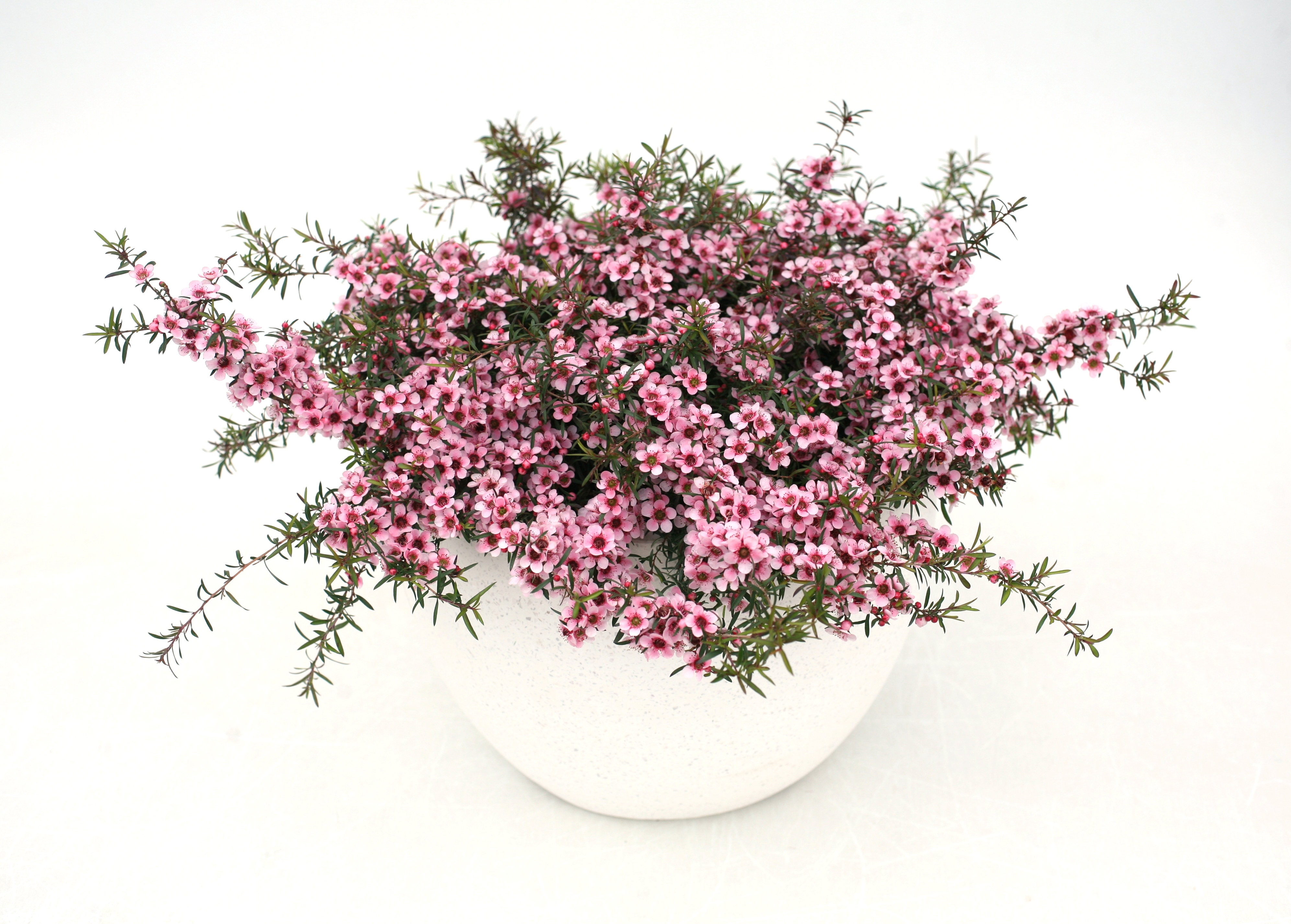 Pink Crystals naturally creates a compact bun like habit and is a low small shrub. Pink Crystals is a selection from seed collected from plants grown in open pollination of Leptospermum scoparium and Leptospermum Pink Cascade. From late winter to spring this dainty plant displays a spectacular mass of pale pink star shaped flowers. Pink Crystals compact habit is useful where low level coverage for in landscapes and garden beds is required, and makes an excellent border plant.