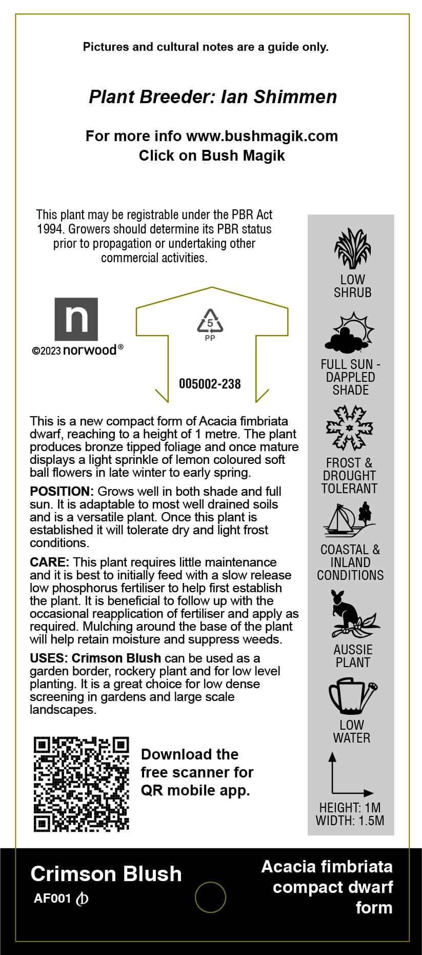 Acacia fimbriata dwarf 'Crimson Blush' - Label
