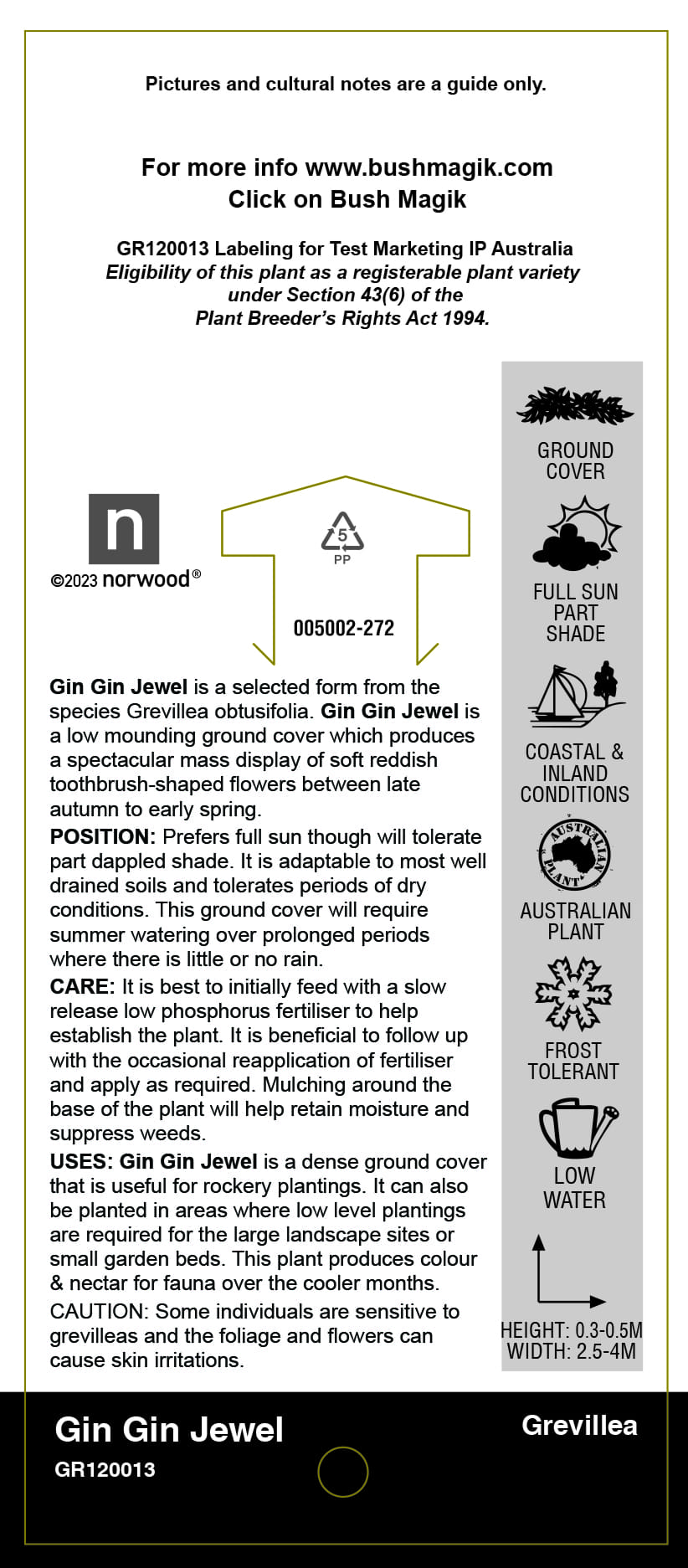 Grevillea obtusifolia hybrid 'Gin Gin Jewel' - Label