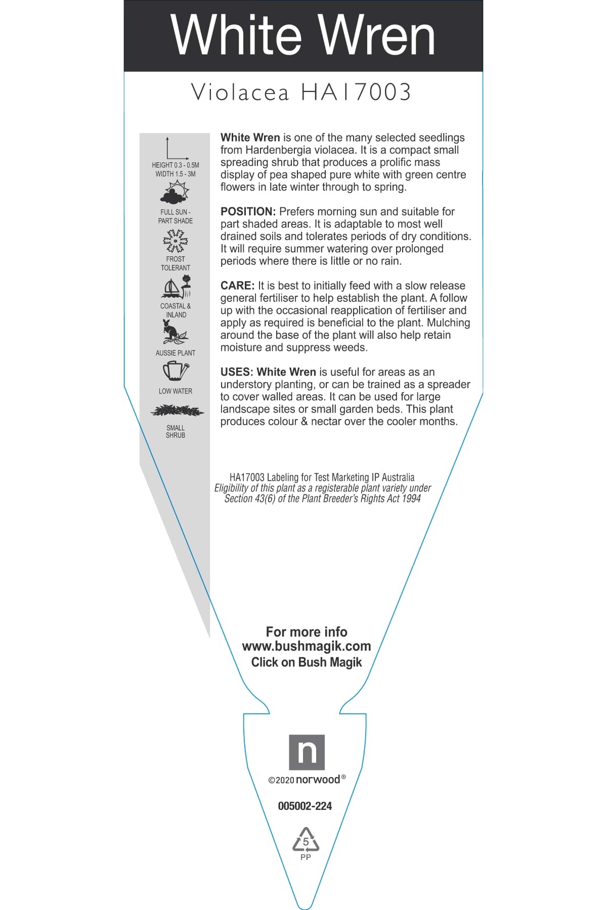 Hardenbergia violacea 'White Wren' - Label