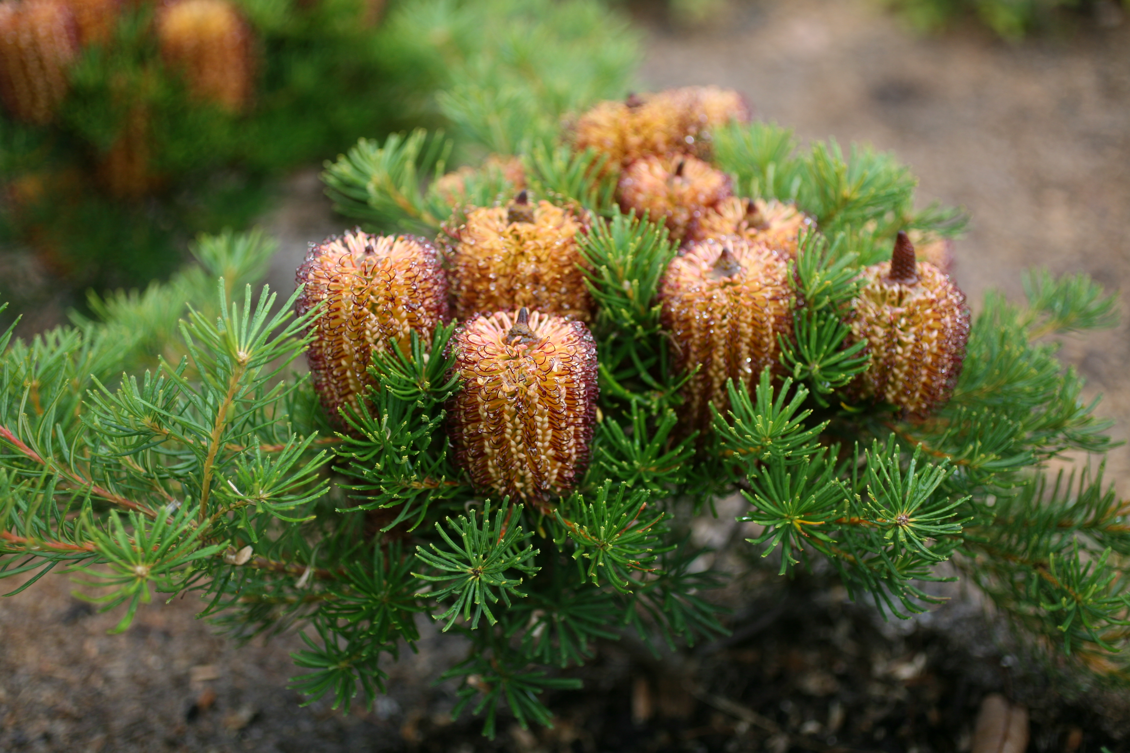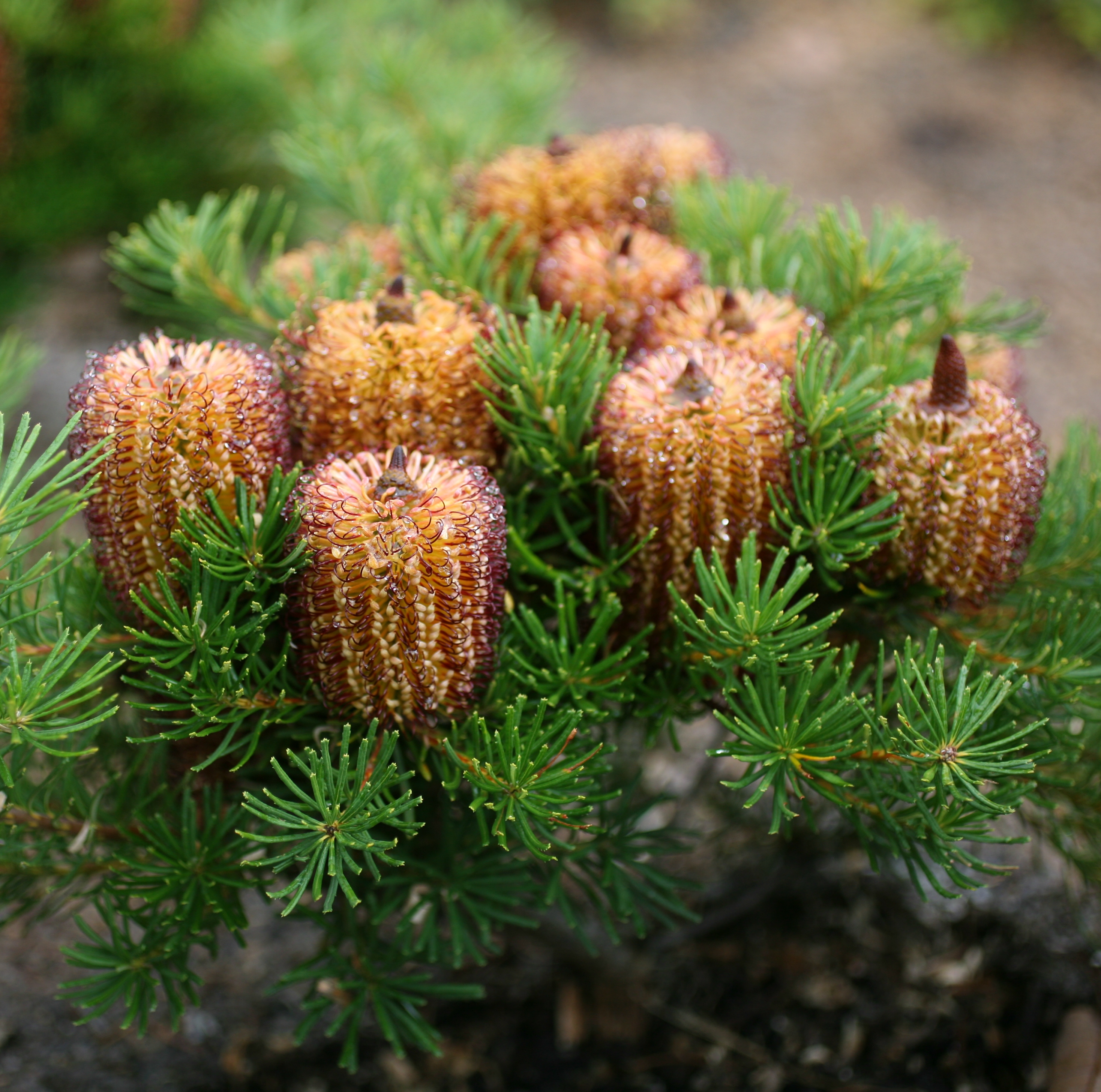 | Information Guide | Bush Candles is a compact low growing form of Banksia spinulosa ‘Hairpin Banksia’. This plant displays a mass of striking golden cylindrical candle like flower heads which appear above the foliage from Autumn through to Winter, and provides nectar for birds and bees over the cooler months. Bush Candles is suitable for any garden that requires low level plantings and can be mixed planted with similar varieties such as Birthday Candles, Cherry Candles, Honey Pots, Stumpy Gold, and Golden Candles. |