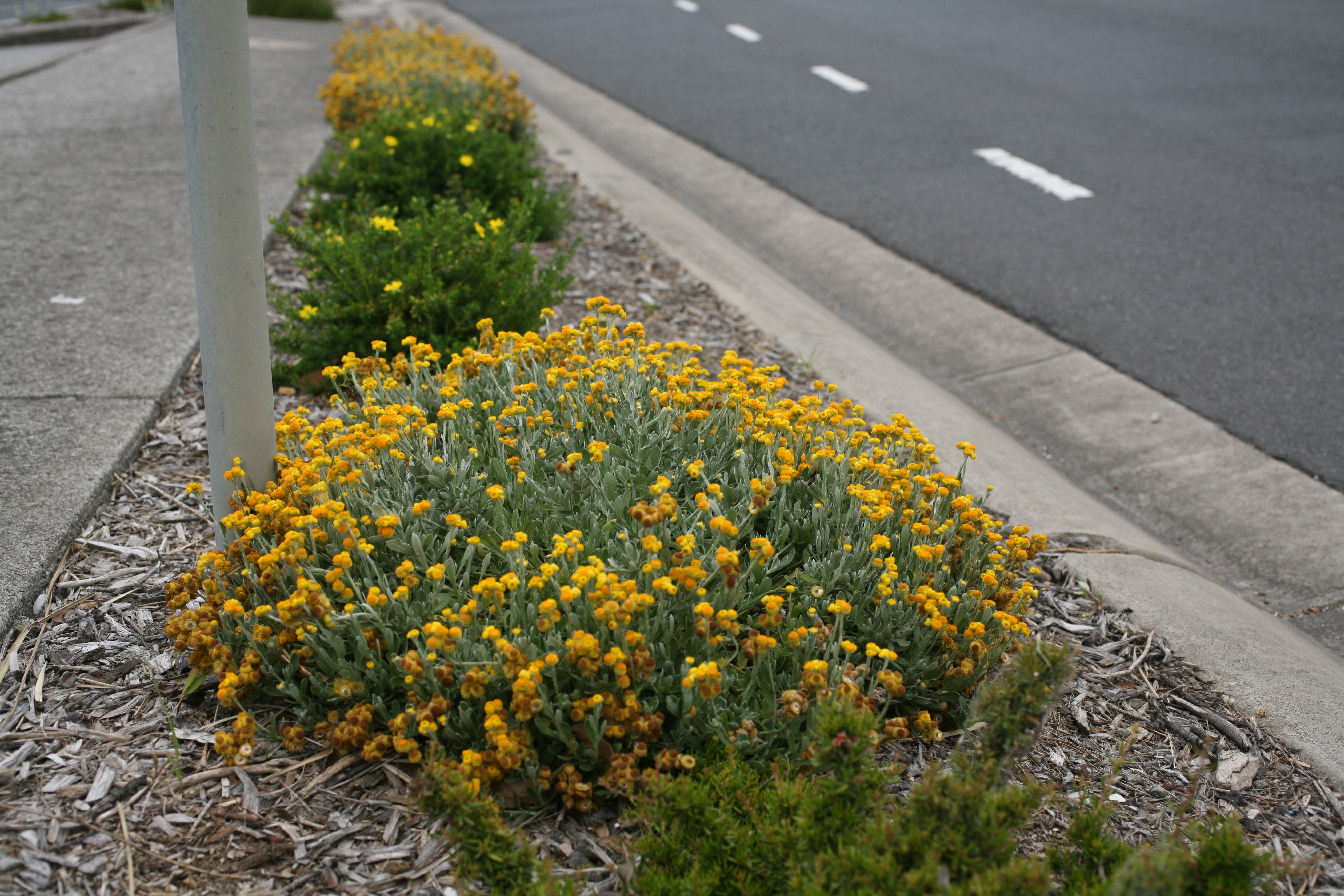 Sun Buttons is a versatile plant offering good foliage contrast in rockeries, borders, tubs and hanging baskets, it is a fast-growing native perennial. Sun Buttons is compact and mounding in habit and differs in its neat form compared to to the existing 'Common Everlasting' and 'Yellow Buttons'. From Spring to Autumn, Sun Buttons produces clusters of yellow button flowers that sit low in the foliage attracting pollinators. Sun Buttons use as a ground cover can be planted among trees and shrubs or as a border in open garden beds. Other similar varieties include "Silver Sunburst', ‘Silver and Gold’, and ‘Desert Flame'. Prefers full sun to part shade in well drained soils, and tolerating frost and short periods of dry. |
