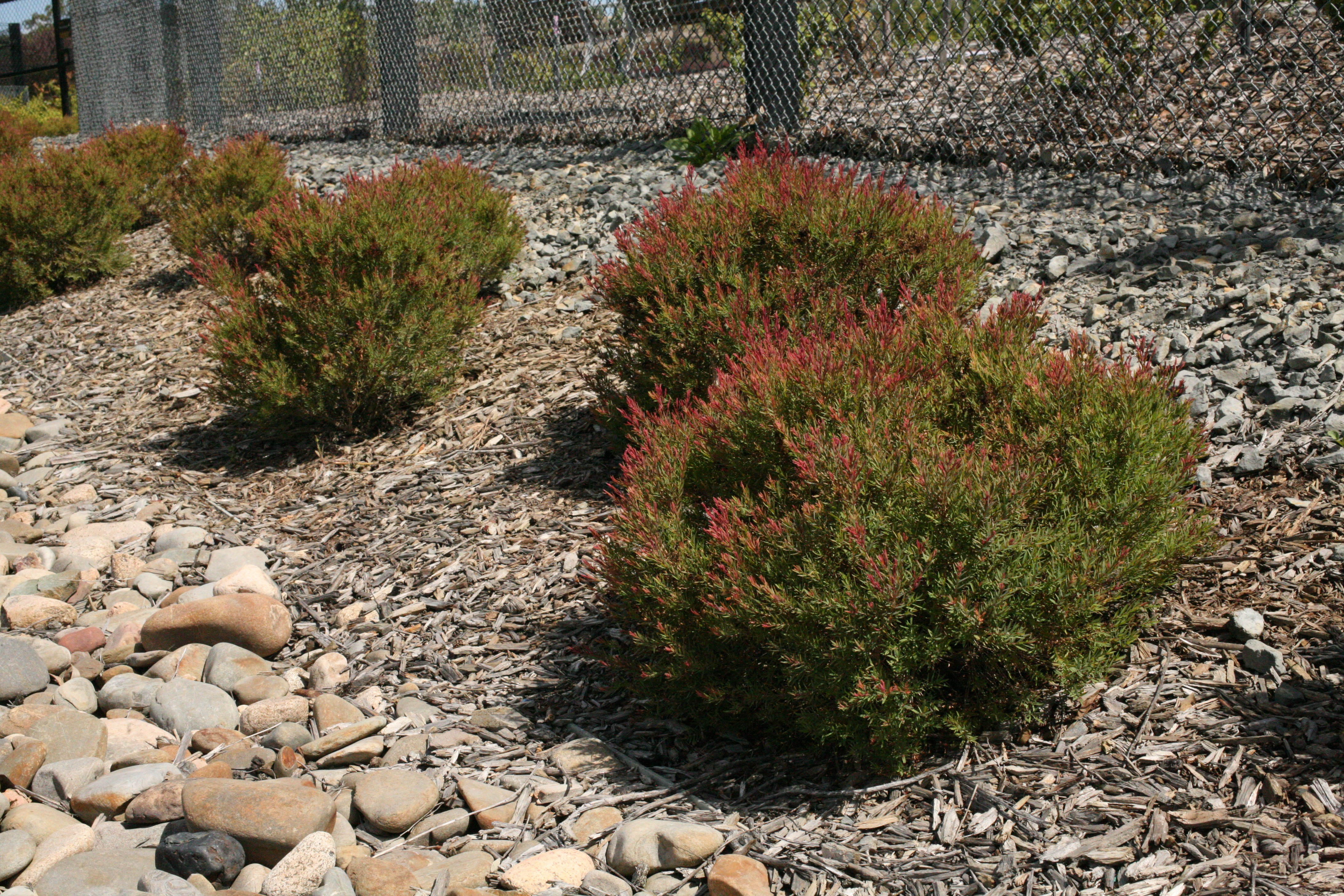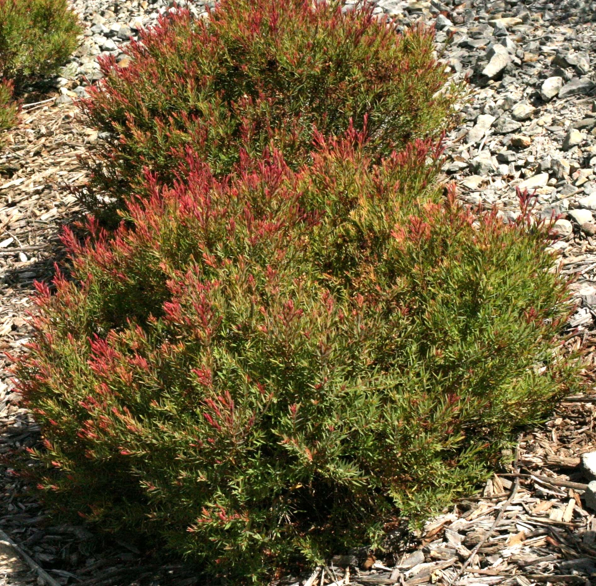 Mini Mel is a dwarf evergreen shrub that naturally forms a round dense ball. The new growth is smokey reddish / bronze colour, and this small shrub emits a rich aroma when crushed. Mini Mel is selected from Melaleuca linariifolia which is a tree commonly known as Narrow-Leaved Paperbark, Flax-Leaved Paperbark and Snow In Summer. The other most similar dwarf varieties are Melaleuca Little Red, Melaleuca Claret Top which can be mix planted with Melaleuca Mini Mel to create contrast. |